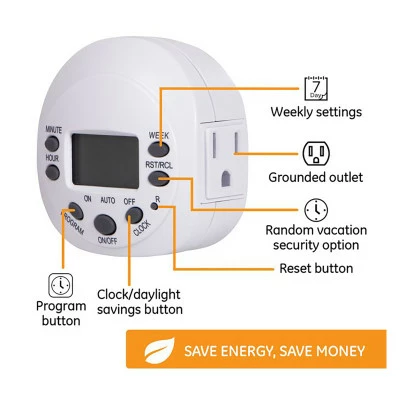 Automate your plug-in lamps or small appliances according to your weekly schedule with the GE Indoor Plug-In 7-Day Digital Timer, White. This plug-in timer module allows you to automate a single plug-in lamp or device using easy preset options or custom settings for each day of the week. Program up to 16 On/Off events per day for each day of the week. A built-in override control still allows for manual operation of the plugged-in device.
