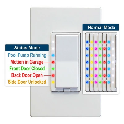 The LED on the switch operates in two different modes: normal mode and status mode. Whenever an event within your smart home network (such as an alarm triggering) corresponds to a status event you have programmed into the switch, the LED switches from “normal mode” to “status mode” and illuminates/blinks accordingly. When no status conditions are active, the LED operates in “normal mode.”