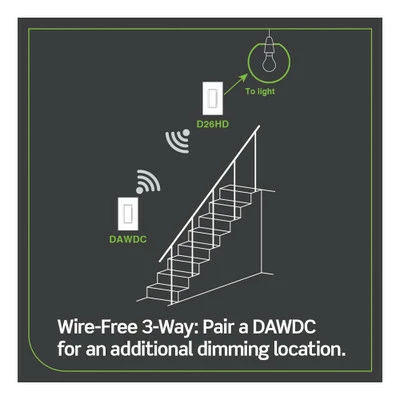 The Decora Smart Anywhere Dimmer Companion is the perfect solution for adding a switch where wiring or a wallbox with a traveler wire may not be present, such as at the base of a staircase, the end of a hallway or open areas with multiple entrances like a large kitchen or family room. Anywhere Switch Companions also connect with Decora Smart Wi-Fi 2nd Gen Mini Plug-Ins to add On/Off control over small plug-in lamps and electronics.