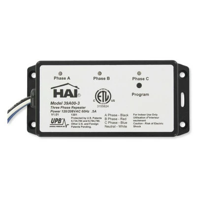 The UPB Wired-In 3-Phase Repeater (a Leviton/HAI product) enables communication between UPB devices on a three-phase 120/208VAC delta-wye, 60Hz electrical system. The main purpose of the Three-Phase Repeater is to transfer UPB multi-packet messages transmitted on one phase (leg) of the electrical system and strongly repeating them on to the other phases (legs) to ensure proper communication. The Three-Phase Repeater is perfect for 3-phase environments including multi-dwelling units, apartments, condominiums and light commercial office and restaurant facilities.