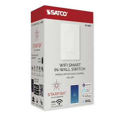 The SATCO Starfish Wi-Fi On-Off Wall Switch replaces an existing wall switch, enabling On/Off control over a connected light using Wi-Fi or voice commands. This smart switch supports incandescent, LED, and resistive loads up to 6A, and motor loads up to 3.6A. A single pole or 3-way switch can also be used with this Wi-Fi wall switch and you’ll need a neutral wire for operation (sold separately). Once connected using the Starfish Smart Lighting App (iOS or Android), you’ll be able to control the switch with your smartphone or by using your voice via Amazon Alexa, Google Home, or Siri. No smart hub required.
