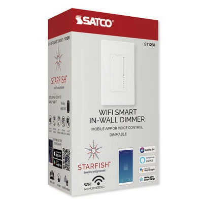 The SATCO Starfish Wi-Fi On-Off Wall Switch replaces an existing wall switch, enabling On/Off and dimming control over a connected light using Wi-Fi or voice commands. This smart switch is rated for use with up to 450W of incandescent and dimmable LED loads. A single pole or 3-way switch can also be used with this Wi-Fi wall dimmer switch and you’ll need a neutral wire for operation (sold separately). Once connected using the Starfish Smart Lighting App (iOS or Android), you’ll be able to control the switch with your smartphone or by using your voice via Amazon Alexa, Google Home, or Siri. No smart hub required.