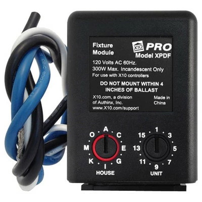 The X10 PRO Wired-In Dimmer Fixture Module responds to ON/OFF, DIM/BRIGHT and ALL LIGHTS ON/OFF commands from an X10 controller. The module can be mounted using adhesive strips. It is equipped with leads for easy installation.
